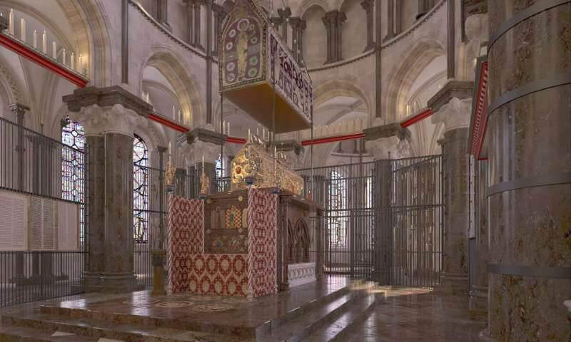 Le modèle de l’équipe est basé sur l’aspect qu’aurait eu le sanctuaire en 1408, une époque où le sanctuaire de Canterbury accueillait jusqu’à 100 000 pèlerins par an. La reconstruction fait valoir que le sanctuaire a été créé beaucoup plus tôt, entre 1180 et 1220, et qu’il aurait probablement fallu plus de trente ans pour le construire et l’orner.