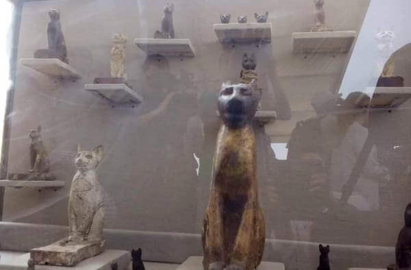 Près de la pyramide du pharaon Ouserkaf (vers -2260) a été mis au jour un complexe funéraire beaucoup plus récent, puisqu’il remonte à la Basse Epoque (de vers -750 à-332). Son exploration a livré des dizaines de momies de chats, ainsi que de nombreuses statues représentant cet animal, parfois dorées, et qui pourraient être contemporaines des inhumations. Parmi elles se trouvait aussi une statue de Bastet, une déesse égyptienne figurée avec une tête de chat et particulièrement révérée à Bubastis, une cité du delta du Nil. Bastet était une déesse protectrice, aussi associée à la musique, au plaisir et à la danse, dont le culte, bien que très ancien, prit un nouvel essor à la Basse Epoque et à l’époque ptolémaïque.